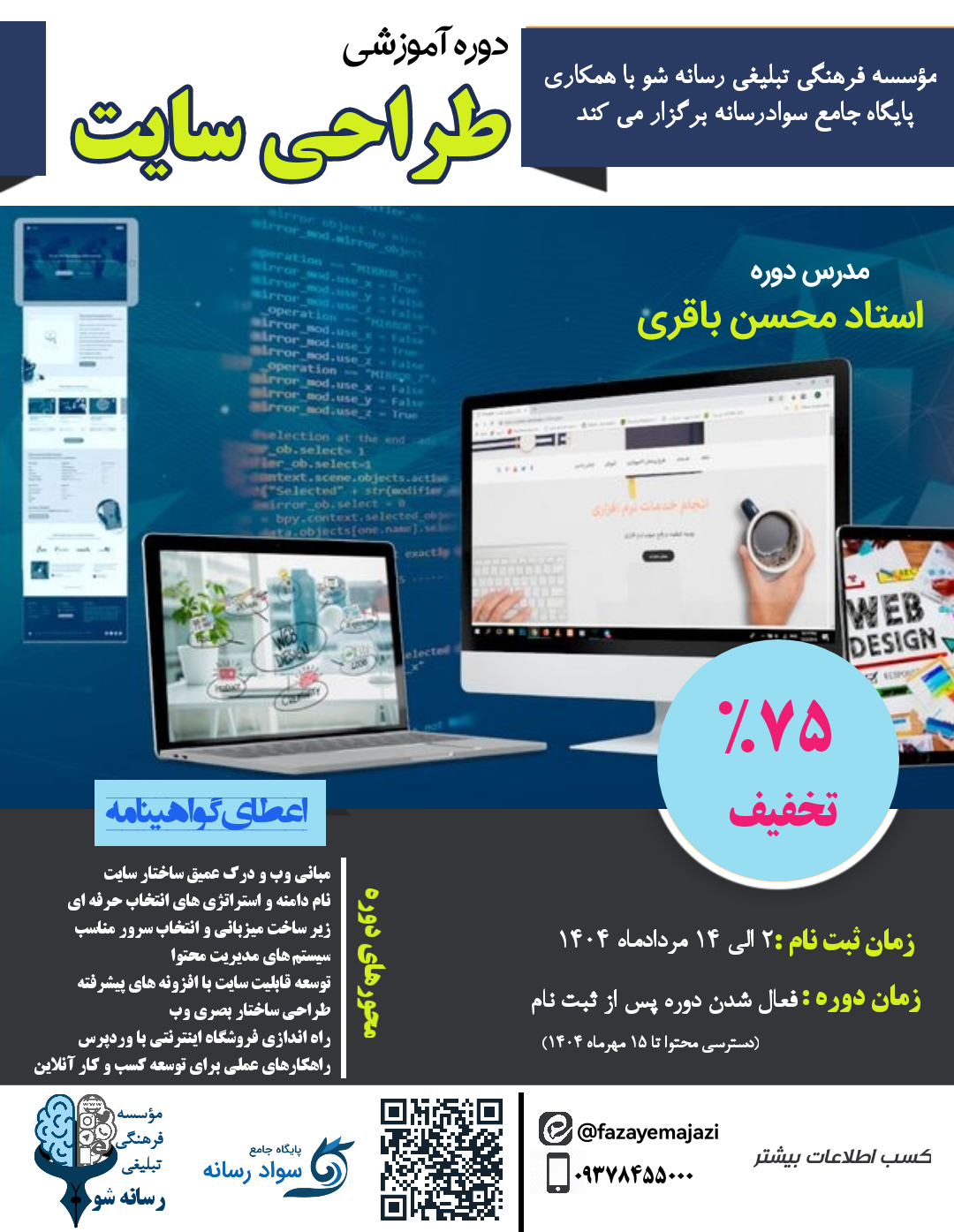 مؤسسه فرهنگی تبلیغی رسانه شو دوره آموزشی طراحی سایت را برگزار می نماید.