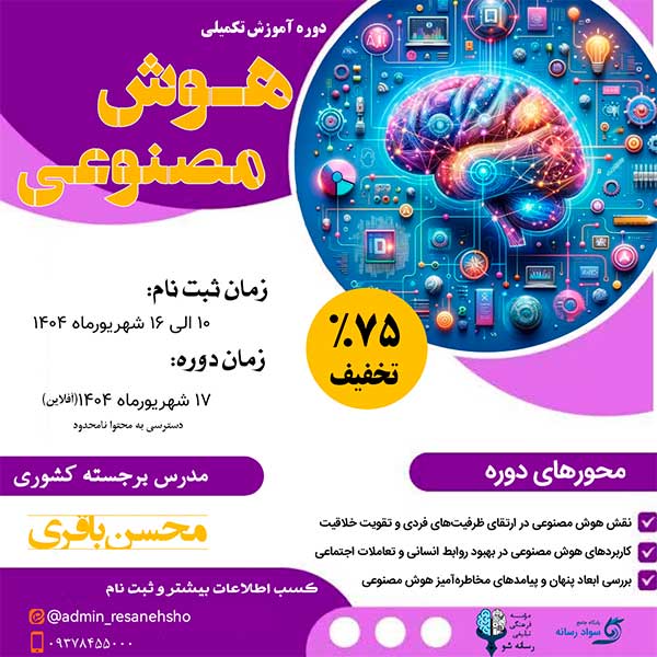23 آگوست اخبار دوره آموزش تکمیلی هوش مصنوعی سپتامبر 2, 2025 توسط resanesho 0 نظرات به گزارش روابط عمومی مؤسسه فرهنگی تبلیغی رسانه شو، سمیه مسگرزاده مدیرعامل مؤسسه فرهنگی تبلیغی رسانه شو بنابر رشد سریع هوش مصنوعی و تحول...ادامه مطلب